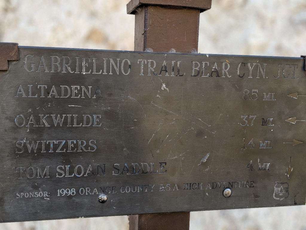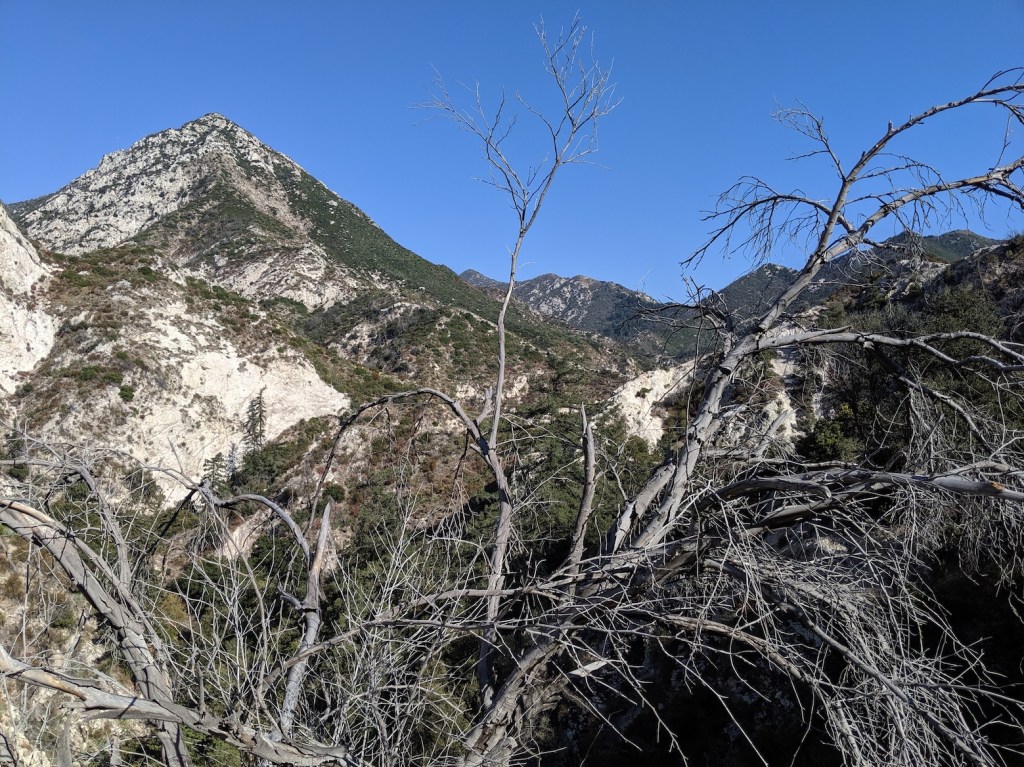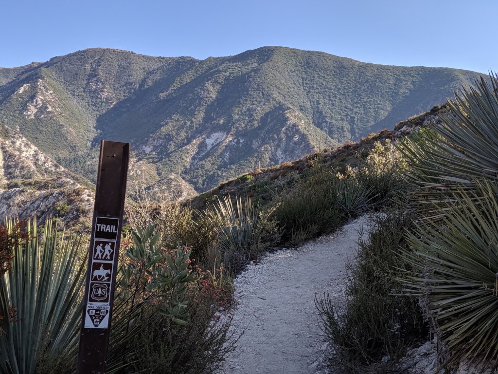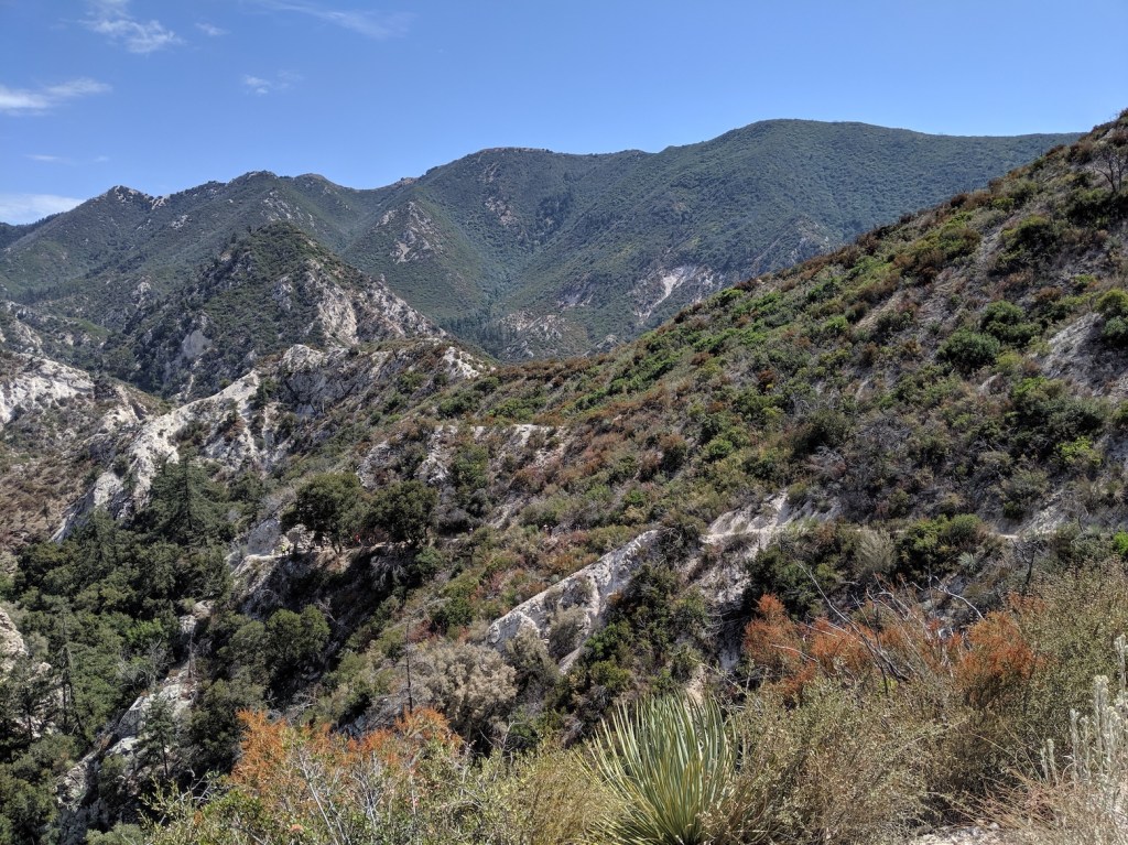 Starting by crossing the bridge at the south end of the car park, we followed the hike as described until we got to what the book describes as an ‘unmarked junction’ with the Arroyo Seco trail heading southwest (now clearly signposted, to Altadena). Having walked most of the time until now along the riverbed among trees (with ten or so easy river crossings involving stepping stones), we were enjoying being higher up and out of the trees, so we opted to ignore the rest of the route and strike off down the (still closed) southwesterly trail (naughty us).