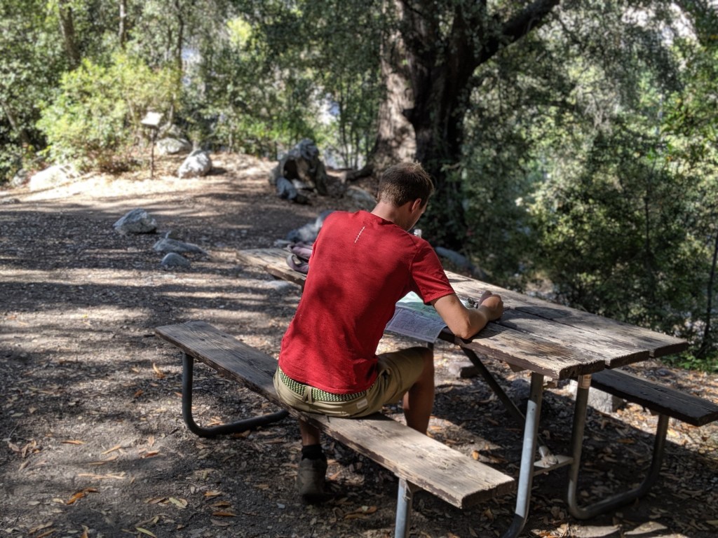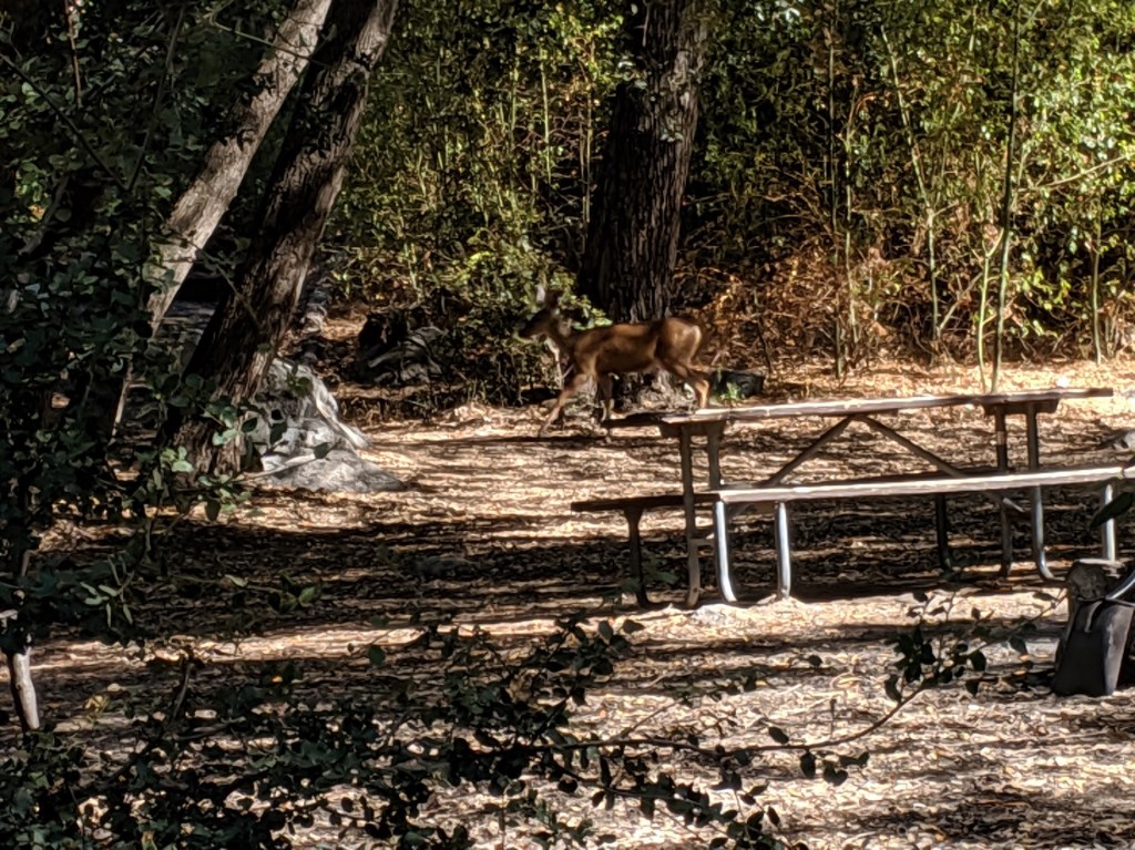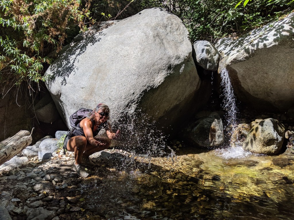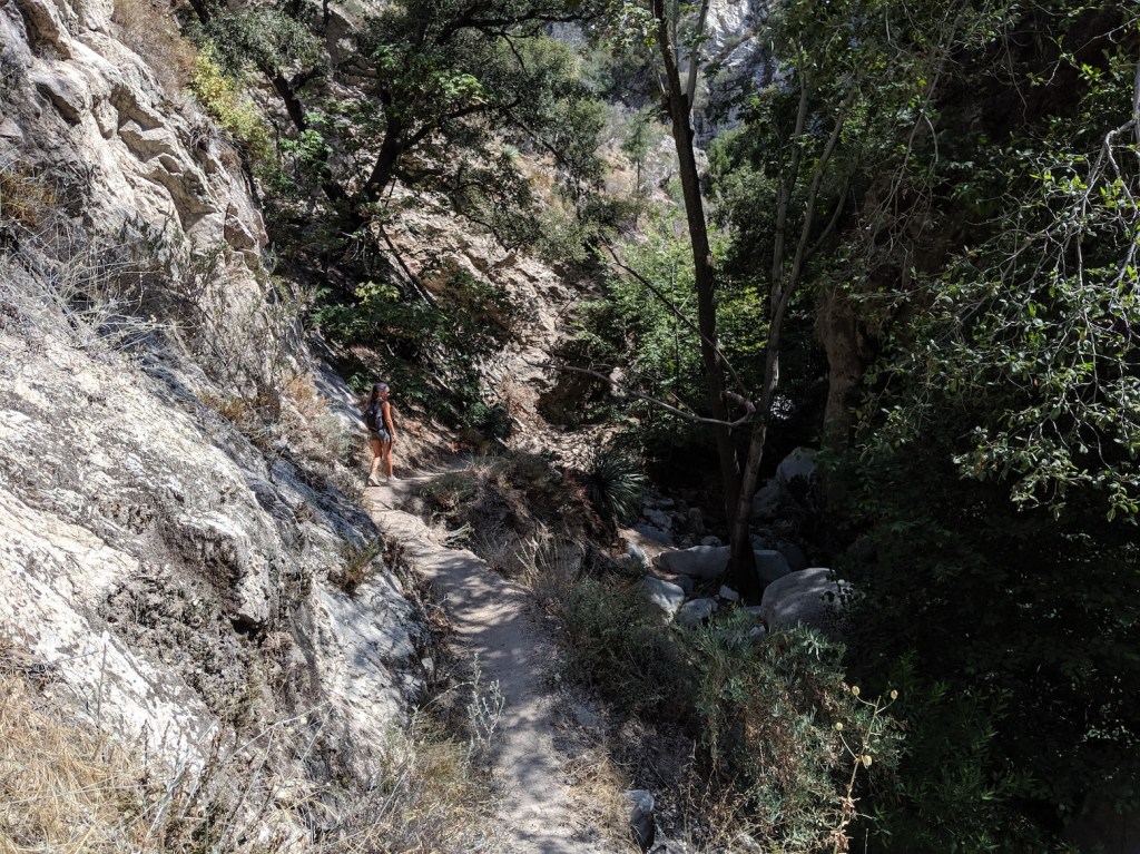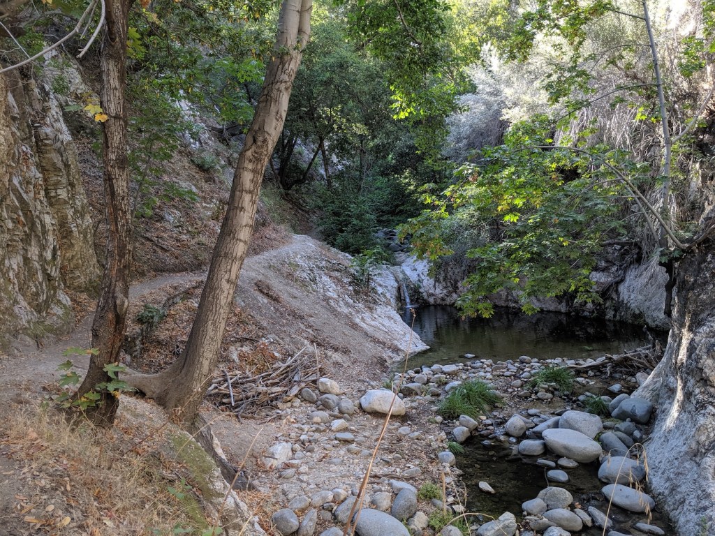 Rough details: It was 1.5 miles (2.35 km) to the stream crossing; another half a kilometre to where the path drops down into the gorge; 2.1 miles (3.4 km) and 45 minutes to the Bear Canyon trail (you can turn left for the falls here, but waterfalls are always disappointing, especially in Southern California at the tail end of summer, so we didn’t). Then it was another 2 km to the Bear Canyon campground. We carried on a bit from there, hoping the gradual rise of the canyon, eventually meeting the Tom Sloane trail over to Mount Lowe, might give us something better than the tedious buzzing slog along the streambed. But it didn’t, so we turned round after about another half a kilometre, getting back to the campground at about the 1 hour 40 mark (and 4.3 miles / 7 km). There, giving up on anything like a view or a break from the flying pests, we had a reluctant and record-breakingly quick lunch (7 mins for bagels and crisps!), though we did spot a beautiful specimen of bouncy fauna (see below). On the way back we had a traumatic moment thinking we might strip off for a swim/paddle in one of the deep pools along the path. I was just bending down to untie my laces when James pointed at a rattlesnake meandering through the sun-speckled water. We were back at the junction with the Falls path after 2 hours 35 minutes, and to the car at 3.5 hours, after 8.5 miles (13.6 km) total.