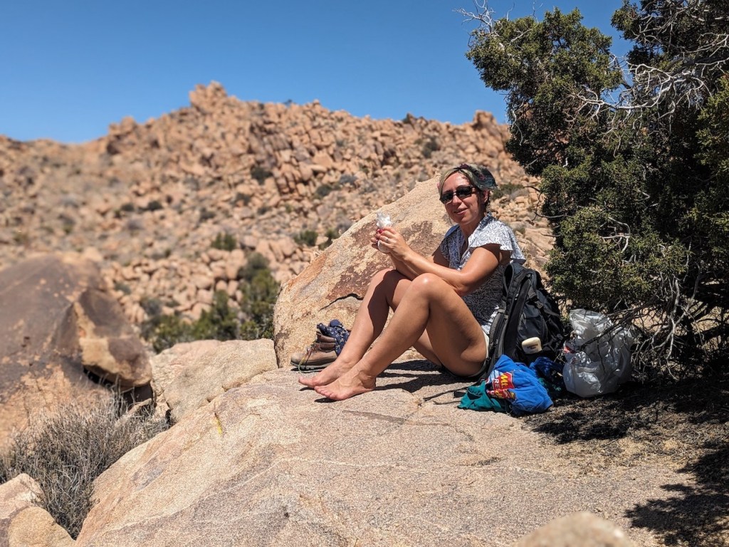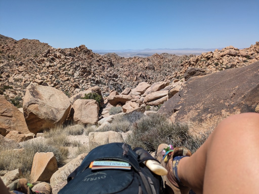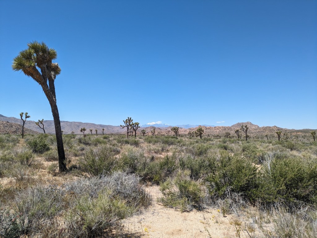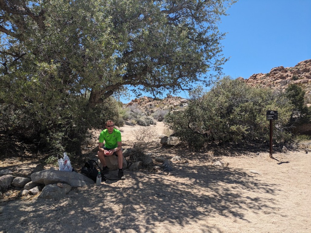 As you head north from the junction with the Willow Hole trail, this route takes you through a beautiful wide undulating expanse of Joshua trees with Mount Gorgonio off to the west, still properly snow-capped for us in late May. A little over an hour from the trailhead, and soon after the path meanders into a wash, you reach the junction with Big Pine trail (we stopped here for some invigorating hardboiled eggs). Another 10 minutes or so of wash and the views open out again to the distant plains to the north. A few minutes after this, we found a nice rocky perch above the trail to eat (and drink!) the rest of our picnic before retracing our steps.