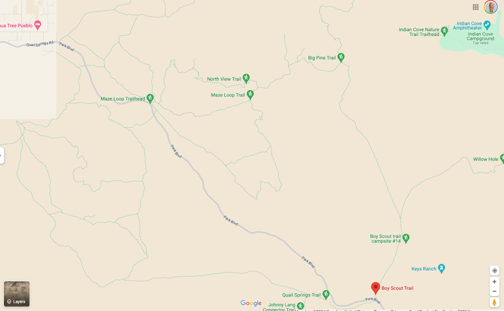 Drive: about 2.5 hours (135 miles) from old town Pasadena, east on the 210, the 10, and the 62, and then a right turn at Joshua Tree onto Park Blvd for the final 12 miles to Boy Scout trailhead